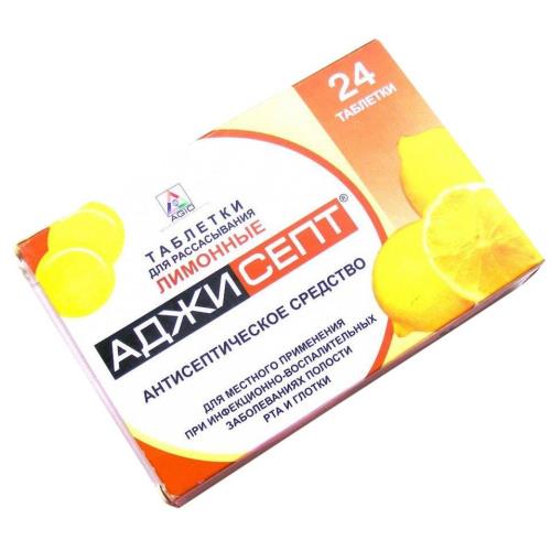Аджисепт ® , таблетки для рассасывания [лимонные]. Активный ингредиент: 2,4-дихлорбензиловый спирт 1,2 мг Амилметакрезол 0,6 мг Вспомогательные ингредиенты: Сахароза, декстроза, лимонная кислота безводная, ментол, ароматизатор лимонный, краситель солнечный закат желтый, краситель хинолиновый желтый, вода очищенная.