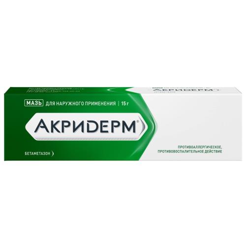 Акридерм® – глюкокортикостероид для наружного применения. Оказывает противовоспалительное, противоаллергическое, антиэкссудативное, сосудосуживающее, противозудное и антипролиферативное действие. Тормозит накопление лейкоцитов, высвобождение лизосо- мальных ферментов и провоспалительных медиаторов в очаге воспаления, угнетает фагоцитоз, уменьшает сосудисто-тканевую проницаемость, препятствует образованию воспалительного отека. При нанесении на поверхность кожи, препарат оказывает быстрое и сильное действие в очаге воспаления, уменьшая выраженность объективных симптомов (эритема, отек, лихенификация) и субъективных ощущений (зуд, раздражение, боль).