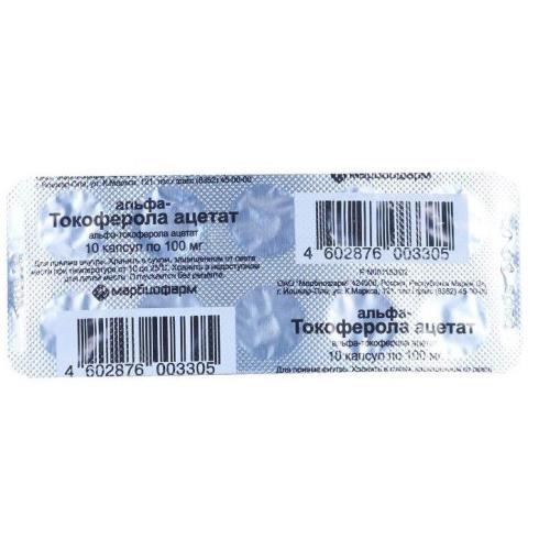 Активные компоненты - витамин Е (альфа-Токоферола ацетат) – 100 мг; вспомогательные вещества - подсолнечника масло (масло подсолнечное рафинированное дезодорированное) –100 мг;