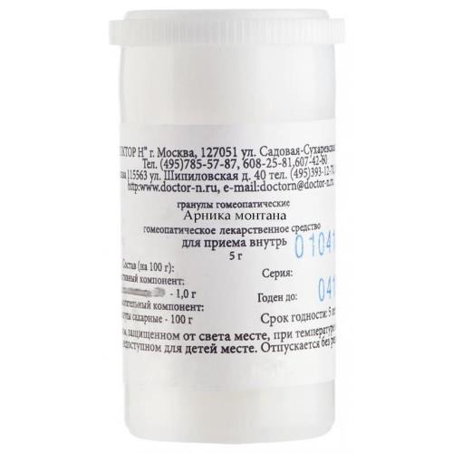 Вспомогательные вещества: сахароза, лактоза. 4 г – пеналы со счетчиком гранул (1) – пачки картонные. Номер и дата регистрации: П N011372/01 от 06.04.12 Групповая принадлежность: Гомеопатический монокомпонентный препарат растительного происхождения СВОЙСТВА** Arnica montana – многолетнее растение, произрастающее преимущественно в горной местности. Химический состав: флавоноиды и проантоцианиды; каротиноиды и марганец; фенольные кислоты (кофеиновая и хлорогеновая); сесквитерпеновые лактоны, в основном геленалин. Компоненты растения обладают высокой биологической активностью: сесквитерпеновые лактоны отвечают за противовоспалительные, антиэкхимотические и болеутоляющие свойства растения. Геленалин также обладает антисептическим действием; флавоноиды и проантоцианиды обладают сосудопротекторным действием.Показания к применению