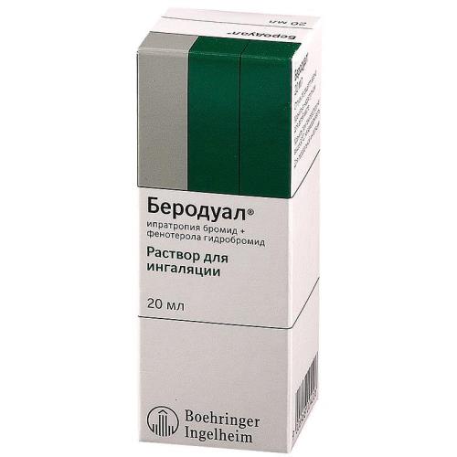 БЕРОДУАЛ содержит два компонента, обладающих бронхолитической активностью: ипратропия бромид - м-холиноблокатор, и фенотерол - 2-адреномиметик.