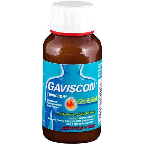 При приеме внутрь Гевискон быстро реагирует с кислым содержимым желудка. При этом образуется гель альгината, препятствующий возникновению гастроэзофагеального рефлюкса. При регургитации гель с большей вероятностью, чем содержимое желудка, попадает в пищевод, где он уменьшает раздражение слизистой оболочки.