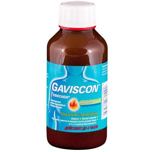 Гевискон®, суспензия для приема внутрь [мятная]. При приеме внутрь Гевискон® образует защитный барьер на поверхности содержимого желудка, препятствуя забросу кислоты из желудка в пищевод на период до четырех часов.