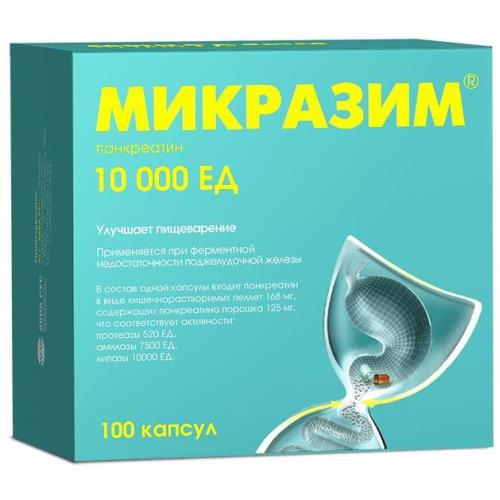 Доза препарата подбирается индивидуально в зависимости от возраста, степени выраженности симптомов и состава диеты. Подбор дозы осуществляется с помощью зарегистрированных лекарственных препаратов Микразим® 10000 ЕД и Микразим® 25000 ЕД. Капсулы принимают внутрь, запивая достаточным количеством нещелочной жидкости (вода, фруктовые соки). Если разовая доза препарата больше 1 капсулы, следует принять половину от общего количества капсул непосредственно перед приемом пищи, а другую половину - во время еды. Если разовая доза - 1 капсула, ее следует принять во время еды. При затрудненном глотании (например, у детей или пожилых людей) капсулу можно раскрыть и принимать препарат непосредственно в микрогранулах, предварительно смешав их с жидкостью или жидкой пищей (рН<5,0), не требующей пережевывания (яблочное пюре, йогурт). Размельчение или разжевывание пеллет, а также добавление их к пище с pH выше 5,5, приводит к разрушению их оболочки, защищающей от действия желудочного сока. Любая смесь микрогранул с пищей или жидкостью должна приниматься сразу же после приготовления., Допустимая доза для детей в возрасте до 13 лет - 50000 ЕД/сут.; старше 1,5 лет - 100 000 ЕД/сут. Продолжительность приема панкреатина может варьировать от нескольких дней (нарушение пищеварения) до нескольких месяцев или лет (длительная заместительная терапия). Заместительная терапия при различных видах экзокринной недостаточности поджелудочной железы. Доза подбирается индивидуально и зависит от степени выраженности внешнесекреторной недостаточности, индивидуальных пищевых привычек и возраста пациента. Стеаторея (более 15 г жира в кале в сутки). При наличии поносов, снижении массы тела и отсутствии эффекта от диетотерапии назначают 25 000 ЕД липазы при каждом приеме пищи. При необходимости и хорошей переносимости дозу повышают до 30 000 - 35 000 ЕД липазы на один прием. Дальнейшее увеличение дозы, в большинстве случаев, не улучшает результаты лечения и требует пересмотра диагноза, снижения содержания жира в рационе и/или дополнительного назначения препаратов - ингибиторов протонного насоса. При нерезко выраженной стеаторее, не сопровождающейся поносами и снижением массы тела, назначают от 10 000 ЕД до 25 000 ЕД липазы на прием. Муковисцидоз. Начальная расчетная доза для детей младше 4-х лет - 1 000 ЕД липазы на килограмм массы тела при каждом кормлении, для детей старше 4-х лет - 500 ЕД липазы на килограмм массы тела при каждом приеме пищи. Дозу следует подбирать индивидуально, в зависимости от тяжести заболевания, выраженности стеатореи и нутритивного статуса. Поддерживающая доза для большинства пациентов не должна превышать 10 000 ЕД липазы на килограмм массы тела в сутки.