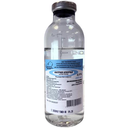 Раствор для инфузий, 0,9 %. Упаковка: По 100, 200, 400 мл препарата в бутылках стеклянных. 1 бутылка с инструкцией по применению лекарственного препарата в пачке из картона. Допускается наносить текст инструкции по применению типографским способом на пачку без инструкции по применению лекарственного препарата. Для стационаров: 36 бутылок без вложения в пачку объемом 100 мл, или 15, 28 бутылок объемом 200 мл, или 15 бутылок объемом 400 мл вместе с инструкциями по применению лекарственного препарата в количестве, соответствующем количеству единиц первичных упаковок, в ящике из картона. По 100, 200, 250, 300, 400, 500, 1000, 2000, 3000 мл препарата в полимерные контейнеры. Контейнер помещают в мешок из полиэтиленовой пленки. Для стационаров полимерный контейнер не упаковывают в мешок из полимерной пленки. 44 контейнера объемом 100 мл, 32 контейнера объемом 200 мл, 28 контейнеров объемом 250 мл, 20 контейнеров объемом 300 мл, 16 контейнеров объемом 400 мл, 12 контейнеров объемом 500 мл, 6 контейнеров объемом 1000 мл, 4 контейнера объемом 2000 мл, 2 контейнера объемом 3000 мл в мешках из полиэтиленовой пленки вместе с руководством по использованию полимерных контейнеров с инфузионным раствором помещают в ящик из картона. Для стационаров: полимерные контейнеры без вложения в мешок из полиэтиленовой пленки упаковывают в ящик из картона вместе с руководством по использованию полимерных контейнеров с инфузионным раствором. Если на поверхность полимерного контейнера или мешка из полиэтиленовой пленки не нанесен текст инструкции по применению лекарственного препарата, то в ящик вкладывают инструкции по применению препарата в количестве, соответствующем количеству полимерных контейнеров.