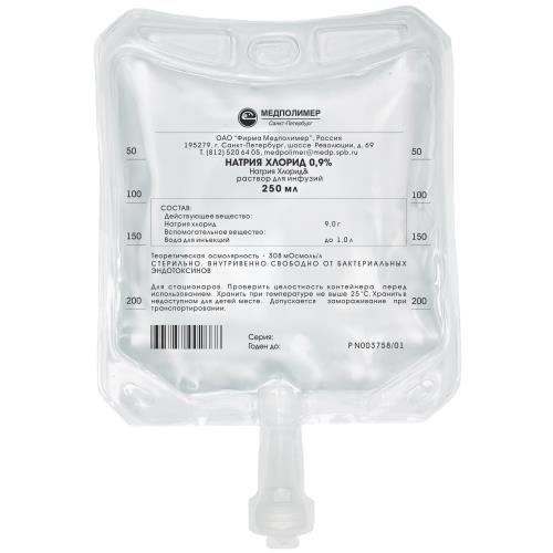 По 50, 100, 150, 200, 250, 300, 350, 400, 450, 500, 750, 800, 1000, 1250, 1500, 2000, 2500, 3000, 3500, 4000, 4500 или 5000 мл в самоспадающихся контейнерах полимерных для инфузионных растворов однократного применения из поливинилхлоридной пленки с одним или двумя портами для инфузионных растворов или из прозрачной многослойной полиолефиновой пленки (без поливинилхлорида) с одним или двумя отдельными полипропиленовыми инъекционными портами типа SFC, снабженными вкладышами узла инъекционного из полиизопрена или из термопластичного эластомера, герметично закрытыми полипропиленовыми колпачками, обеспечивающими контроль "первого вскрытия" или в пакетах для внутривенных инфузий, или по 3000 и 5000 мл в пакетах полиолефиновых для разлива и хранения инфузионных растворов. Контейнеры выдерживают стерилизацию пароводяной смесью при температуре (120+2)°С. Каждый контейнер имеет петлю для подвешивания, резервный объем, для дополнительного введения лекарственного средства не менее 35% объема контейнера, возможность использования системы для инфузии без воздушного клапана. Контейнеры совместимы с двухсторонней канюлей для смешивания растворов.