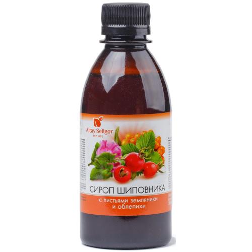 Сироп шиповника с листьями облепихи и земляники. Шиповник содержит огромное количество аскорбиновой кислоты, витамины группы В, Р, провитамина А, минеральных веществ, благодаря чему является прекрасным профилактическим средством, особенно в период простудных и инфекционных заболеваний. Листья земляники содержат витамин С, дубильные вещества, органические кислоты. Листья земляники обладают общеукрепляющими и поливитаминными свойствами, применяются при авитаминозах и простудных заболеваниях. Листья облепихи содержат витамин С, органические кислоты, оказывают стимулирующее воздействие на иммунную систему организма, благодаря чему способствуют повышению защитных сил организма. Прием в суточной дозировке обеспечивает поступление в организм: не менее 60 мг витамина С, что составляет 100% от рекомендуемого уровня суточного потребления (60 мг). Пищевая ценность, г/100 г: углеводы - 60. Энергетическая ценность: ккал/100 г - 240; кДж/100 г - 1020.