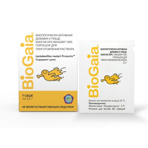 Растворить 1 пакетик в 250 мл охлажденной кипяченой или бутилированной воды. Важно использовать не меньше указанного количества воды, чтобы предотвратить поступление избытка солей в детский организм. Хорошо размешать до полного растворения. Если врач не назначил иначе, придерживайтесь следующих рекомендаций по дозированию БиоГая ОРС. Первый этап приёма БиоГая ОРС составляет 4-8 часов. При рвоте принимайте раствор дробно - часто небольшими порциями. Для ребенка рассчитайте количество раствора, необходимое в течение часа, и давайте пить по 10–15 мл каждые 5–10 мин. при помощи пипетки или чайной ложки. Второй этап приёма БиоГая ОРС включает приём по 50–100 мл после каждого эпизода жидкого стула, но не меньше 50 мл/кг веса тела в сутки до прекращения симптомов. БиоГая ОРС имеет нейтральный вкус, что облегчает применение раствора у маленьких детей. Для придания раствору вкуса можно добавить 0.5 чайной ложки фруктового сока на порцию БиоГая ОРС 250 мл. Раствор можно хранить 3 часа при комнатной температуре или 6 часов в холодильнике.Особые указания
